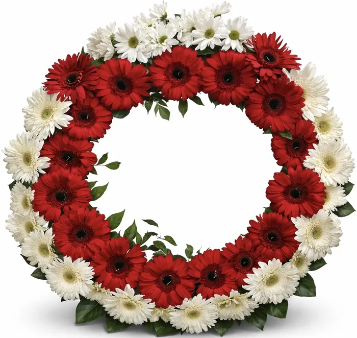 זר אבל עגול ומרשים בשילוב גרברות אדומות ולבנות עם ירק טבעי.