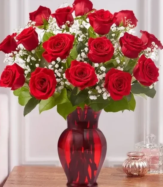 זר 15 ורדים אדומים וגיבסנית לבנה.