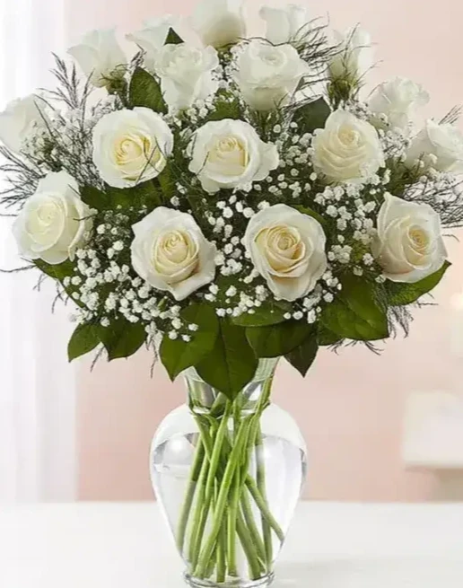 גודל רגיל: 15 ורדים לבנים, גיבסנית וירק - 289 ש"ח