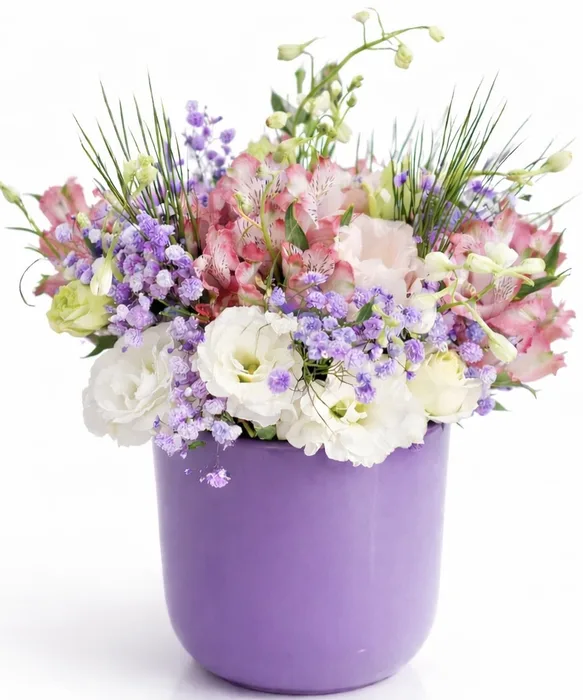 סידור פרחים אלגנטי בעציץ קרמי לילך, מראה רומנטי ואוורירי עם נוכחות יוקרתית.