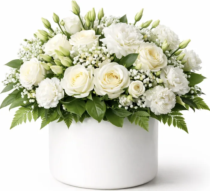 סידור פרחים אלגנטי בגווני לבן עדינים, בשילוב ורדים וליזיאנטוס עם נגיעות גיפסופילה וירק טבעי.